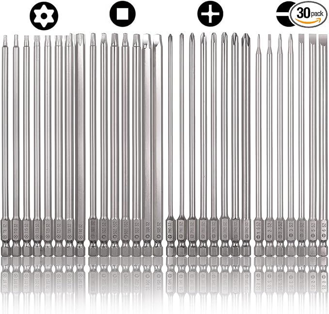 30 Pcs Long Screwdriver Bits for Drill Set 4 Inch, Mixiflor 1/4 Inch Hex Shank S2 Steel Magnetic 4 Inch Long Drill Bits with Storage Box(Slotted+Cross+Square +Torx)