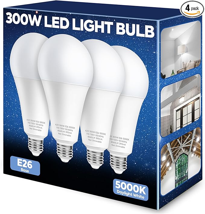 300W Equivalent LED Light Bulb, 4060LM Super Bright A23 LED Bulb, Daylight 5000K, 33W Energy Saving, E26 Medium Base, 120V for Garage, Warehouse, Shop, Supermarket, Non-Dimmable, 4 Pack