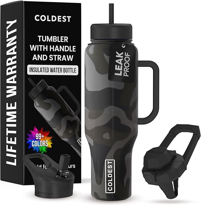 Coldest 40 oz Tumbler with Handle and Straw, 100% Leak Proof Insulated Tumbler with Lid and Straw (3 Lids), Stainless Steel Tumblers for Women & Men, Cup Holder Friendly, 46 oz (Blackhawk Camo)