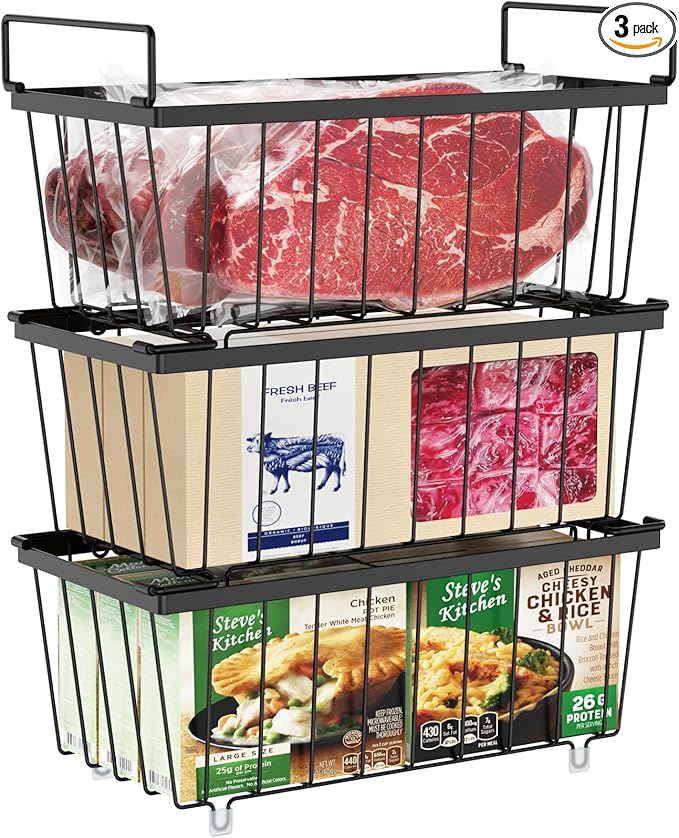 iSPECLE Chest Freezer Basket – 3 Pack Small Stackable Freezer Bins for Most 7 Cu.FT Deep Freezer Sort Frozen Food, Deep Freezer Organizer Bins with Handles Easy to Get Food from Bottom, Black
