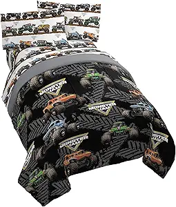 Jay franco Monster Jam Tracks 4 Piece Twin Bed Set – Includes Comforter & Sheet Set – Bedding Features Grave Digger & Megalodon – Super Soft Fade Resistant Microfiber (Official Monster Jam Product)