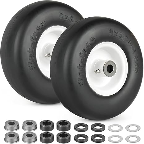LotFancy 9×3.50-4” Flat Free Tire and Wheel, 2 PCS Lawn Mower Tire, 3/4″ or 5/8″ Bushings, 3.5″-4″-4.5″-5″ Centered Hub, Smooth Tread Tire for Zero Turn MowersLotFancy 9×3.50-4” Flat Free Tire and Wheel, 2 PCS Lawn Mower Tire, 3/4″ or 5/8″ Bushings, 3.5″-4″-4.5″-5″ Centered Hub, Smooth Tread Tire for Zero Turn Mowers