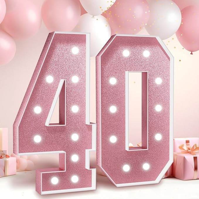 Marquee Numbers Rose Gold 40th-Birthday Decoration: 4FT Large Light Up 40 Year Old Birthday Anniversary Backdrop for Men Women Cardboard White Sign Mosaic Balloon Frame Pink+