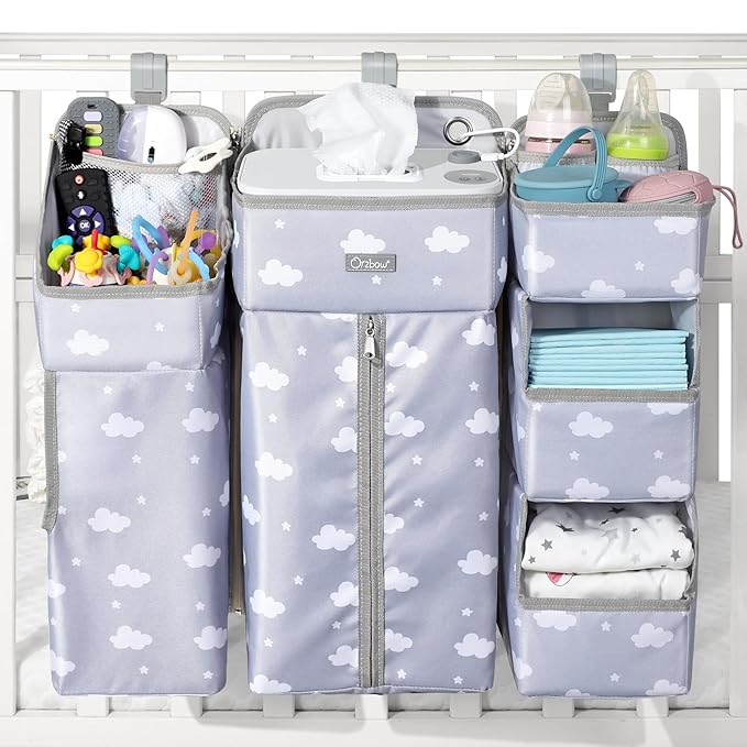 Orzbow XL Hanging Diaper Caddy Organizer for Baby Essentials, Removable 3 in 1 Diaper Stacker, Changing Table Organizer for Crib, Playard, Wall, Multi-Compartments, Two Hang Ways, Grey Cloud