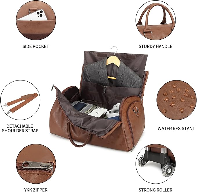 Rolling Garment Bags for Travel,Convertible Duffle Garment Bag Roller Bag Carry on Garment Bag with Wheels Luggage Rolling Weekender Roller Duffle Bags for Travel-Brown