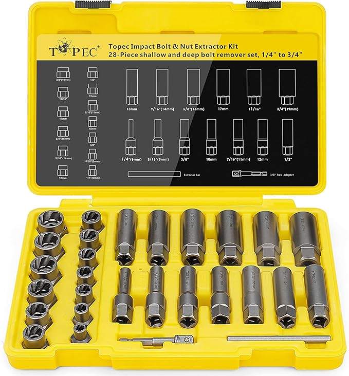 Topec Deep Bolt Extractor Set 28PCS, 3/8″ Drive Bolt Extractor Kit, Spark Plug Extractor Socket Set, Lug Nut Removal Tool for Stripped, Broken, Rounded Bolts Lug Nut Stud Remove