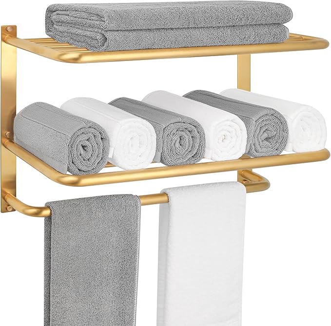 Towel Rack for Bathroom, DEWVIE 23 Inch Tower Holder with Tower Bars, SUS 304 Stainless Steel Lavatory Bath Towel Shelf Towel Hanger Wall Mount, 3-Tier (Brushed Gold)