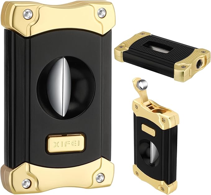 XIFEI Cigar Cutter, Stainless Steel V-Cut Cigar Cutter Built-in Cigar Puncher (Black Gold)