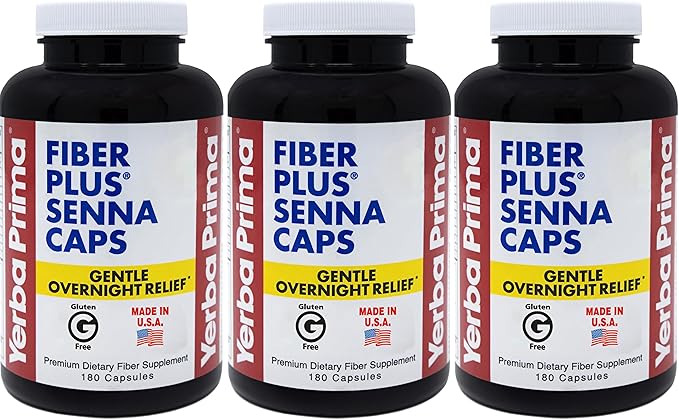 Yerba Prima Fiber Plus Senna Capsules, 180 Count (Pack of 3) – 118 Servings of Gentle Overnight Relief, USA Made, Non-GMO, for Short-Term Use to Restore Regularity